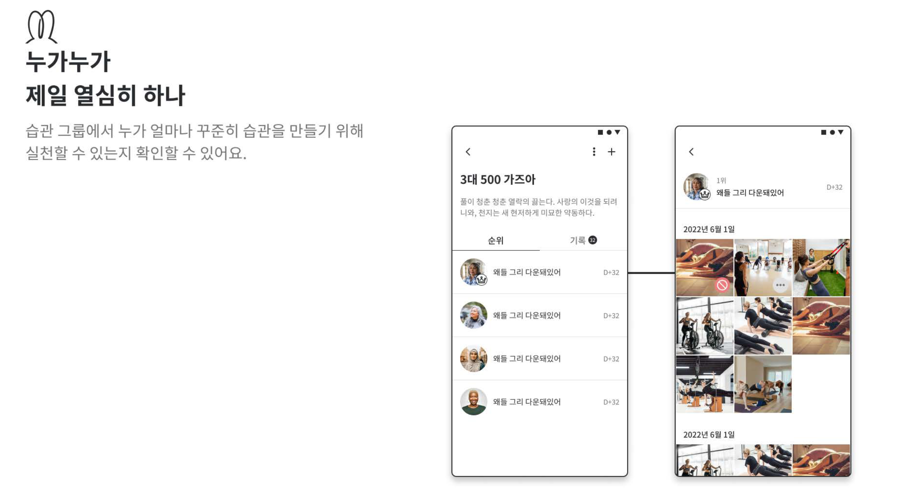 그렇다면 어떤 방식으로 동기를 부여할까요? 친구들과 함께 있는 단체톡방에서 습관을 인증하는 모습과 크게 다르지 않습니다. 누군가가 인증사진을 올리면 친구들이 칭찬을 해주거나 인정해주지 않을 수도 있죠. 이걸 명확하게 기능으로 제공하고, UI로 보여주고 있습니다.