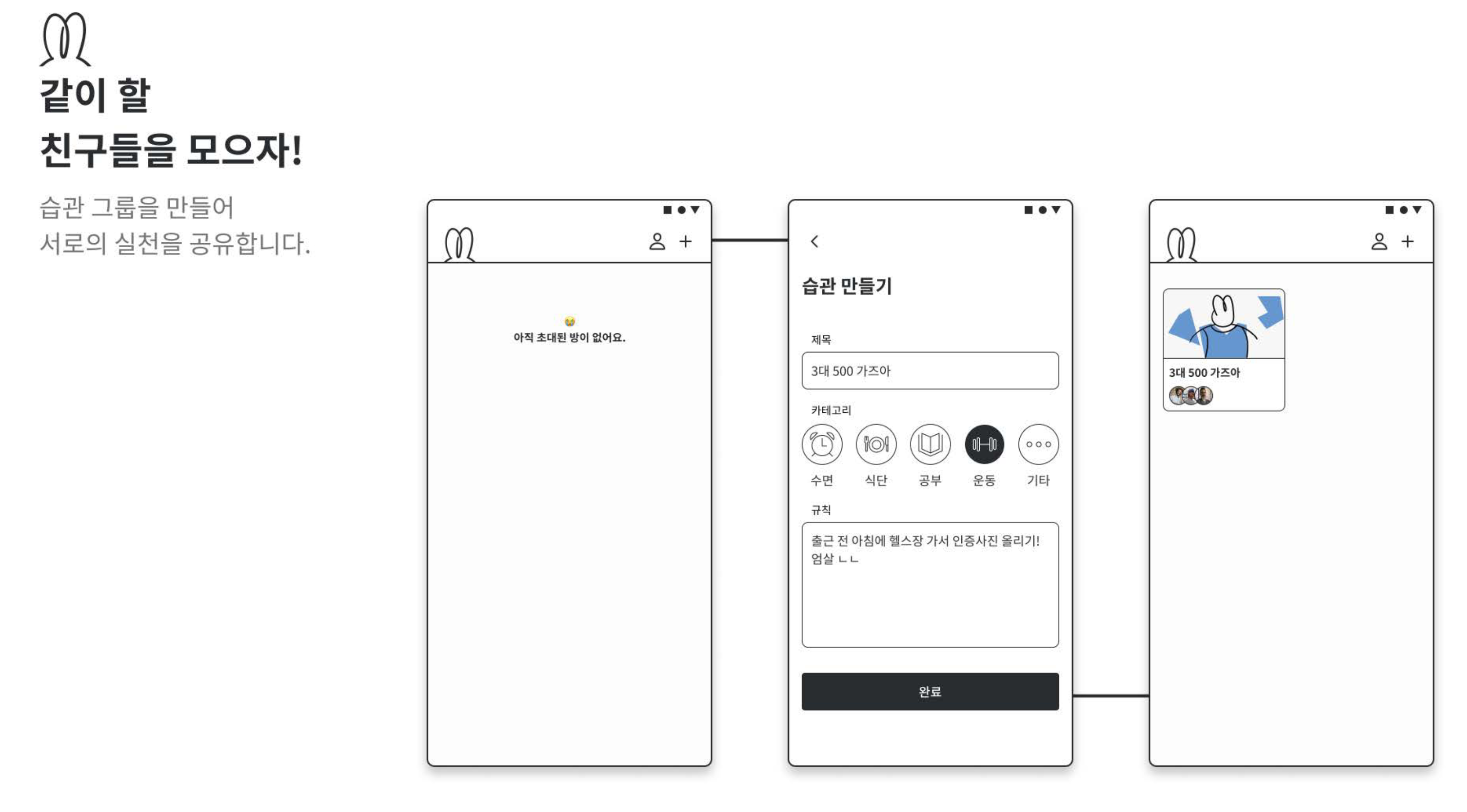 물론 습관을 유지시켜줄 수 있도록 동기부여를 도와주는 서비스는 시중에 많이 나와있습니다. 챌린저스, 루빗 등이 그 예입니다. 챌린저스는 사람들과 함께 공통 목표를 가질 수 있고, "벌금" 이라는 체벌성 동기부여 시스템을 갖고 있습니다. 그에 비해 루빗은 혼자서 귀여운 토끼를 키워가며 관리하는, 알람이 포함된 Todo 리스트에 가깝구요. 저희는 가까운 친구들과 소소하게 서로를 자극해주며 습관을 유지할 수 있는 서비스를 만들고자 했습니다.